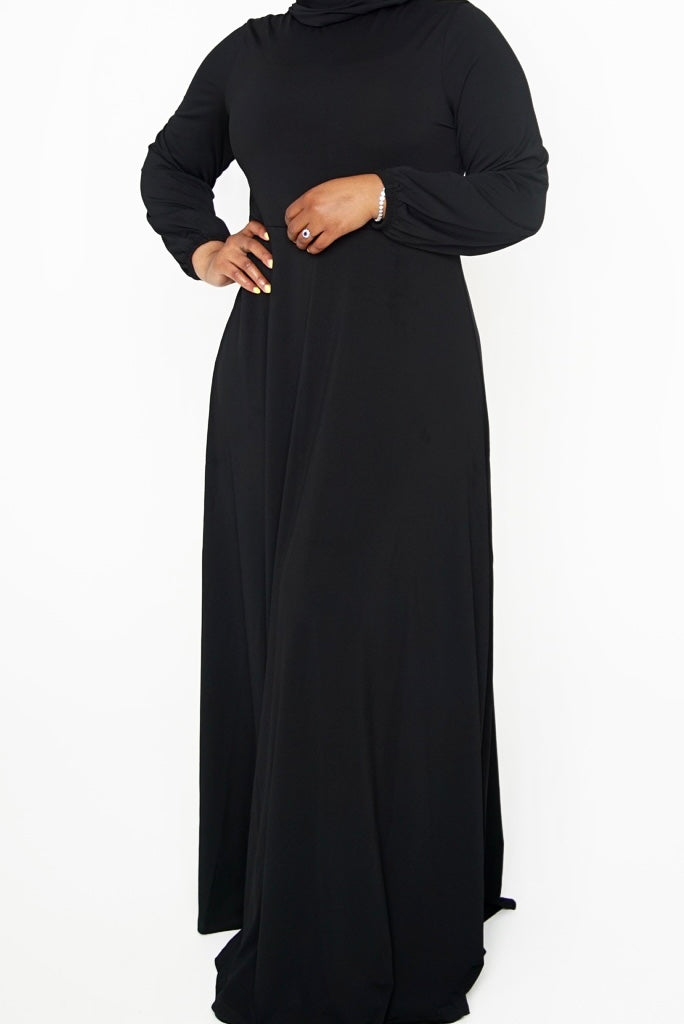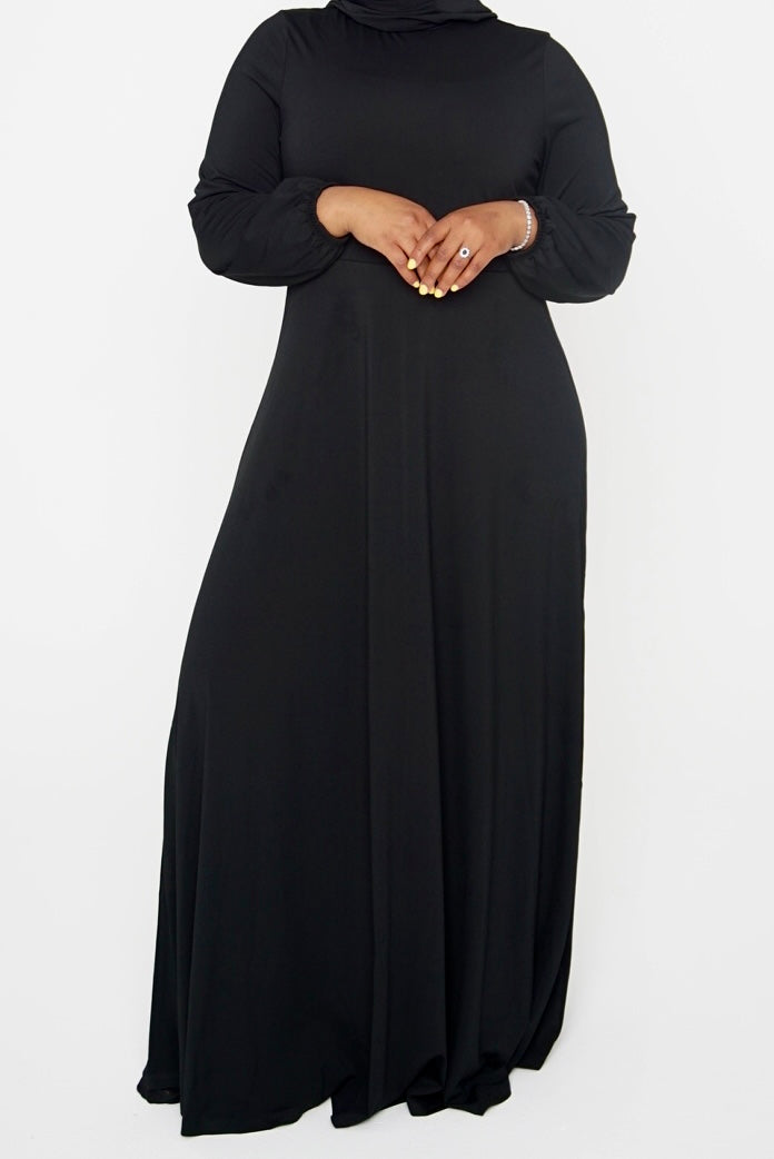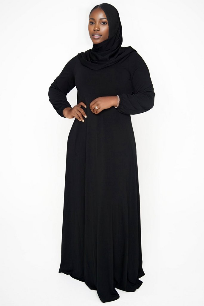 This semi swing dress is your not so basic essential set. It is comprised of stretched fabric that is comfortable and forgiving. It has a mandarin collar and elastic wrist sleeves to make wudu that much easier. It comes with a FREE matching hijab. All dress sets are readymade and packaged. That’s right, no wait time!